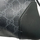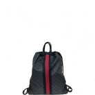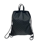 GUCCI Soft GG Supreme Monogram Appia Calfskin Web Drawstring Backpack in Black. This stylish backpack is crafted of Gucci GG monogram coated canvas with black leather corners. The shoulder bag features black leather top handles and interior trim, and black side cable cording. This side cording gathers around the top to cinch the backpack closed and opens to a spacious black nylon fabric interior with a zipper pocket.