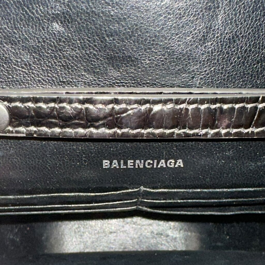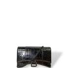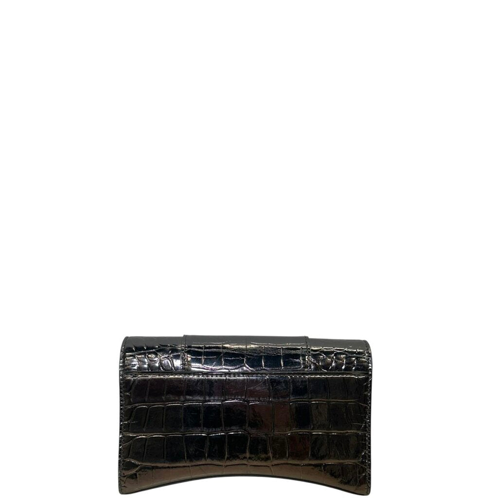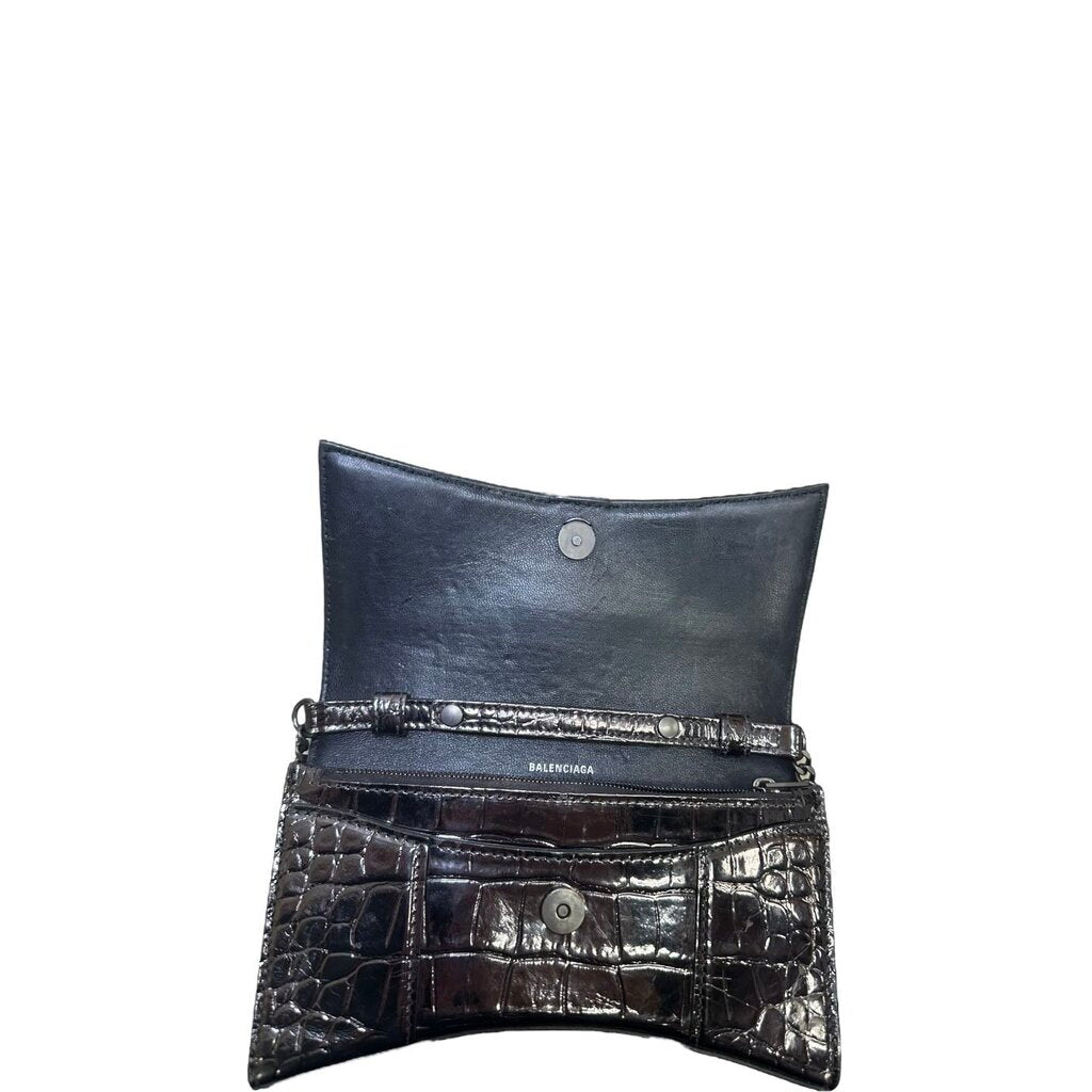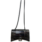 This is an authentic BALENCIAGA Shiny Calfskin Crocodile Embossed Hourglass Chain Bag in Gunmetal. Can be used for a clutch. It features an optional matte ruthenium chain shoulder strap, a rear pocket, and a matte B logo charm. The front flap opens to a black leather interior with card slots, flat pockets and a zipper pocket