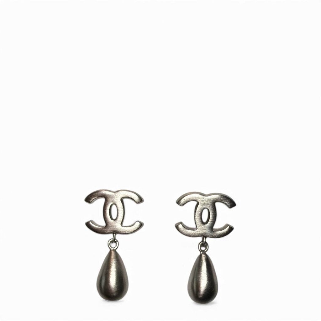 Chanel Interlocking CC Brushed Plated Silver Tear Drop Earrings Silver