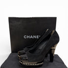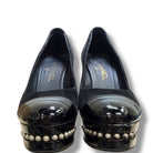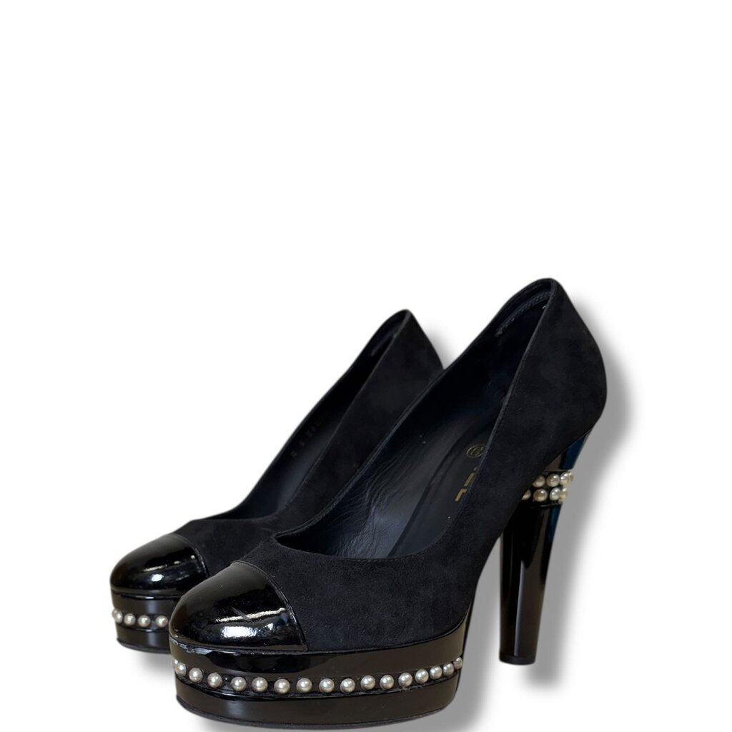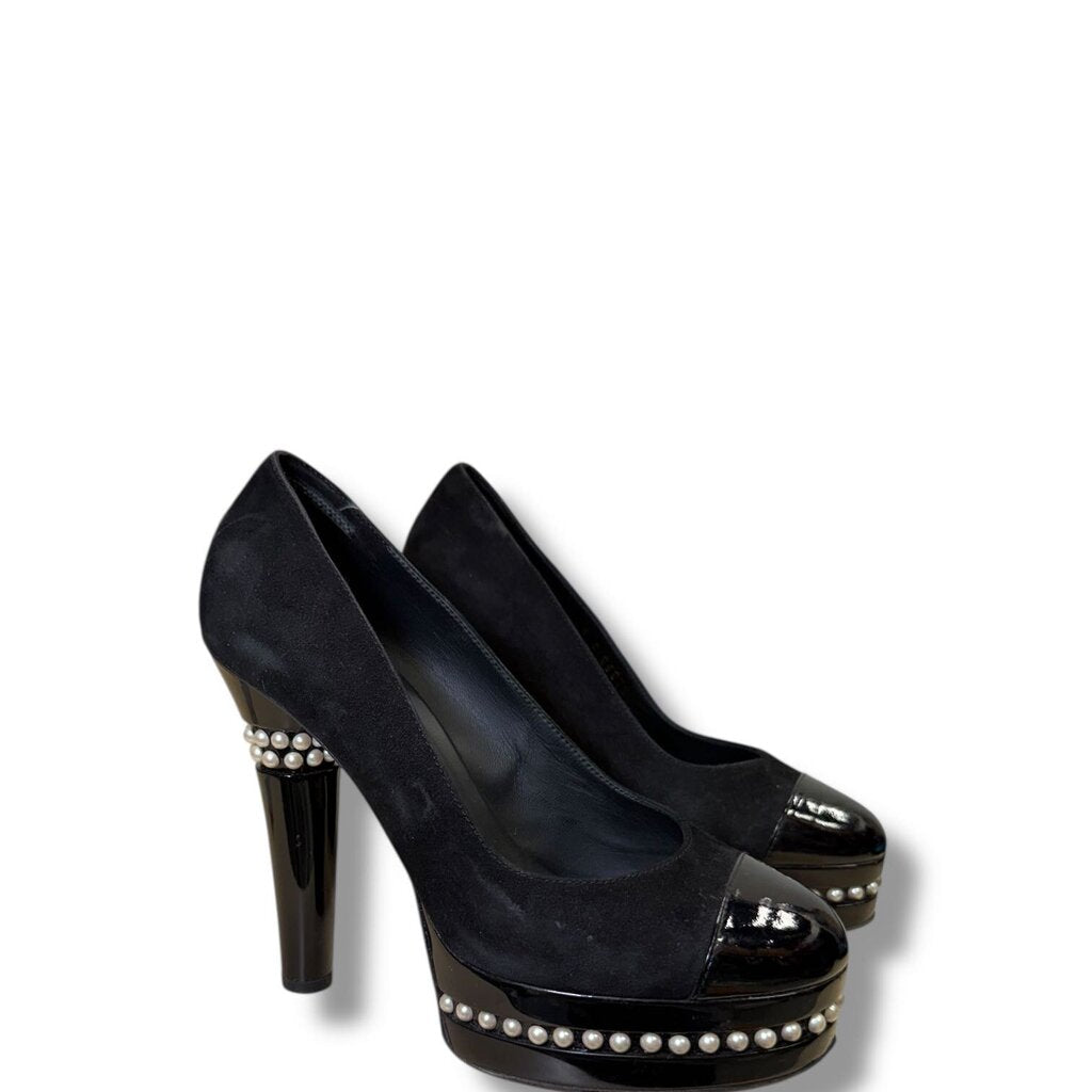 Chanel women Patent Leather and Suede Pearl Trim Platform Heel Black 38