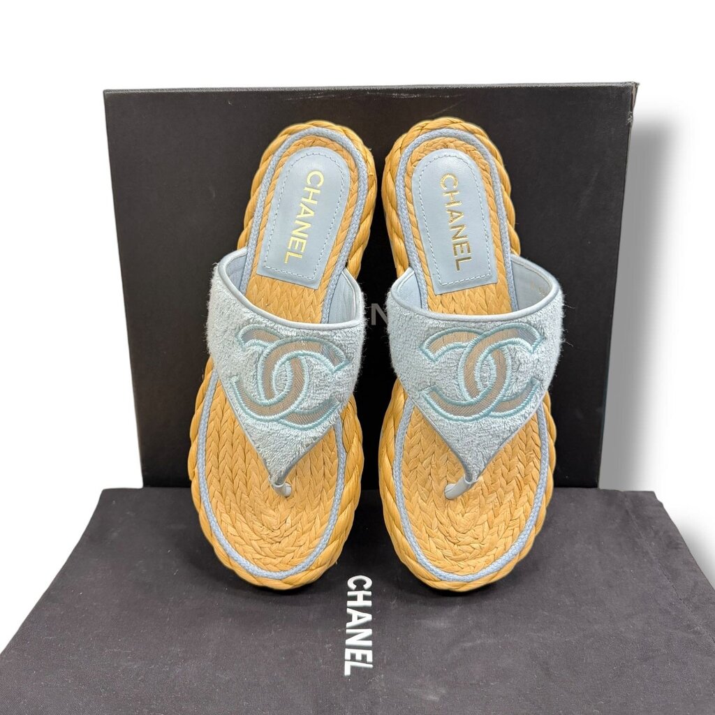 Chanel Beach Thong Terry Cloth Sandals Blue 38.5