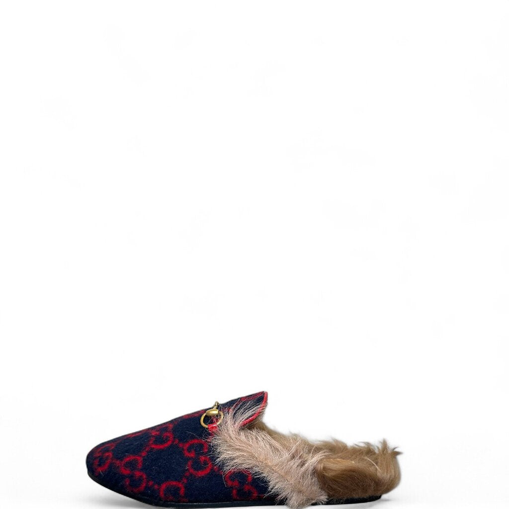 Gucci Princeton Fur Navy Logo Loafers Size: 36.5 In very good condition. Light wear to the bottom soles and fur. Does not come with the original dust bag or box.