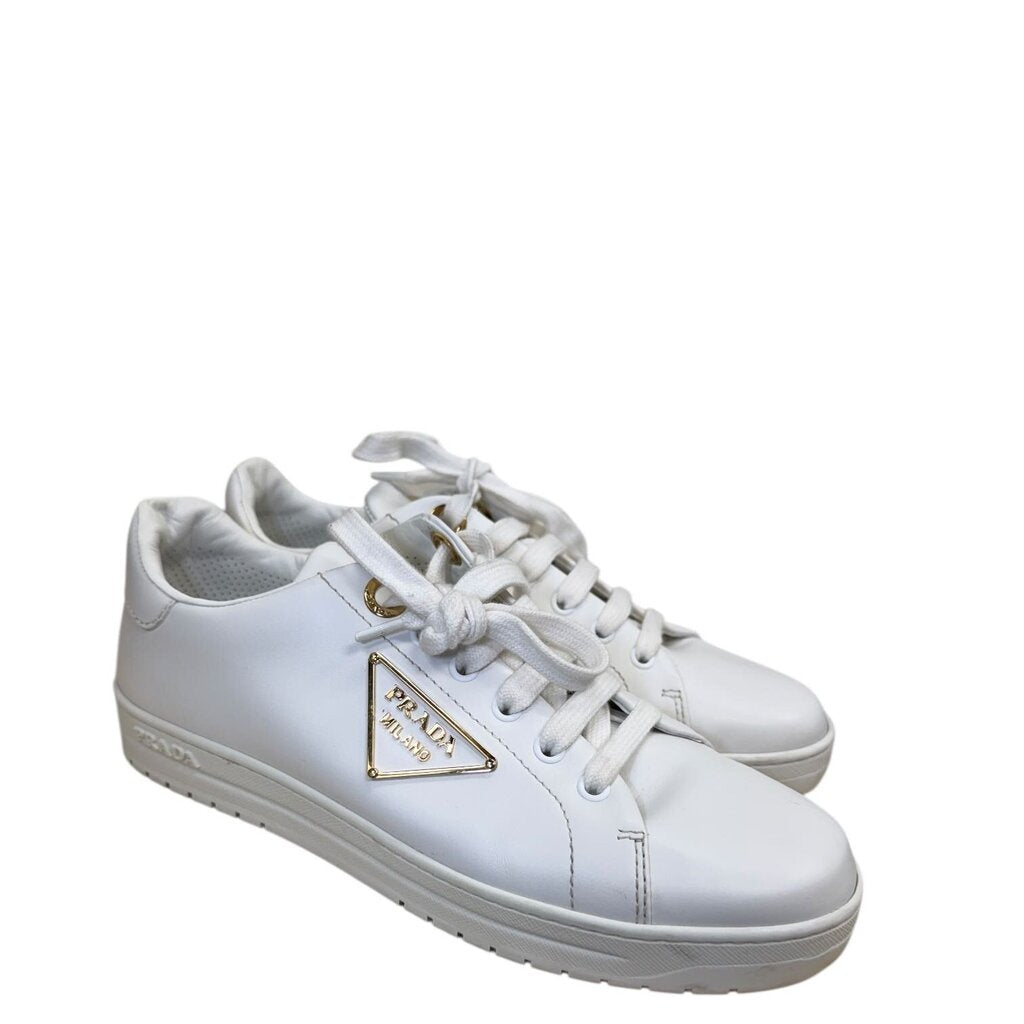 Prada Brushed Leather Triangle Plaque Low Top Sneakers White 38.5
